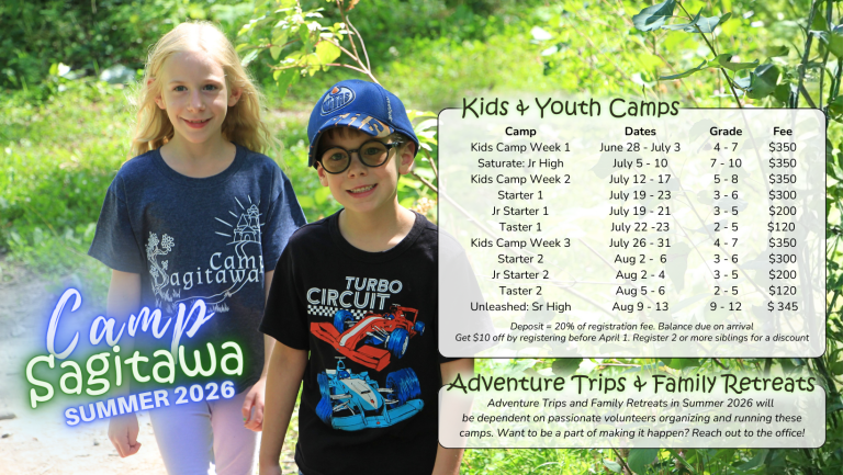 The 2026 Annual Sagitawa Family Retreat will be dependent on registration and staffing. $190 per adult, $90 per camper ages 3-12. Max charge per family $550 **Call the Camp office to be placed on a waiting list**
